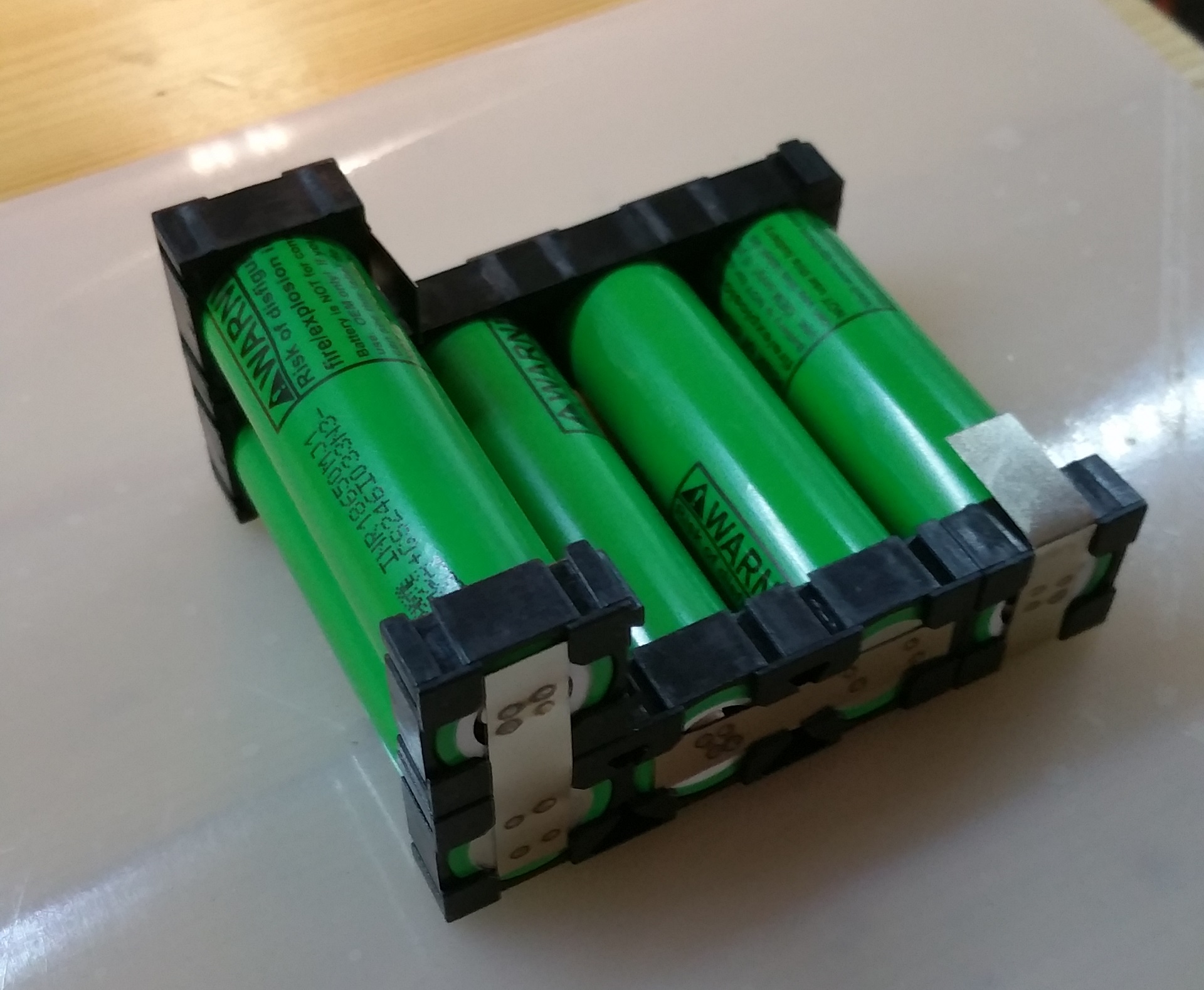 Ik heb deze accu gebouwd om mijn TS100 soldeerbout te kunnen gebruiken zonder stopcontact in de buurt. De accu bestaat uit vijf LG INR18650-MJ1 3500mAh cellen in serie, en komt daarmee uit op een nominaal voltage van 18 volt, en een capaciteit van 63Wh. De TS100 heeft een maximaal vermogen van 65 watt. Dit betekend dat de accu in het uiterste geval binnen een klein uur leeg is. Omdat de soldeerbout dit vermogen alleen nodig heeft bij het opwarmen, zal dit in de praktijk veel langer zijn.