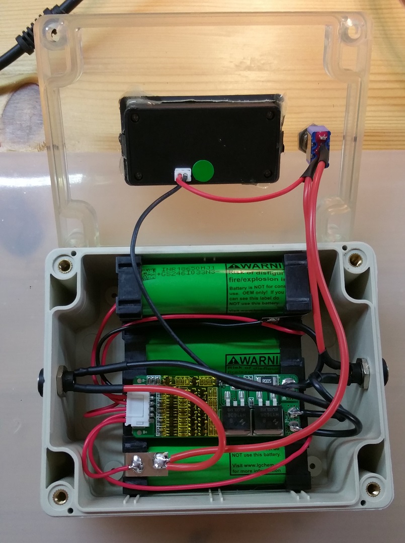De celspanningen worden in de gaten gehouden door dit BMS. Het display geeft het voltage van de accu weer, en vebind hier een "state of charge" aan. De accu kan worden opgeladen met deze lader.